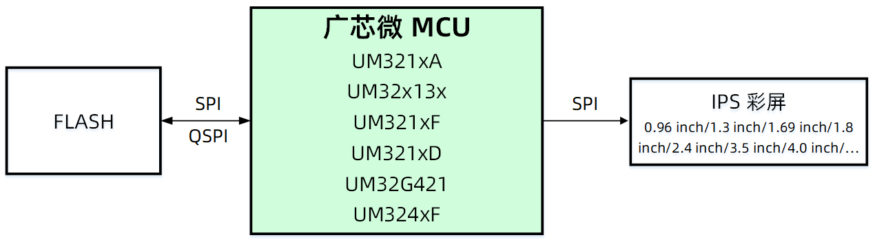 廣芯微IPS彩屏解決方案搭載廣芯微的MCU,通過普通SPI接口(或者QSPI接口)讀取外部FLASH存儲(chǔ)的圖片、動(dòng)畫數(shù)據(jù),再通過另外一路SPI驅(qū)動(dòng)彩屏。對于0.96 inch到4 inch不同尺寸的彩屏,客戶可以選擇廣芯微不同規(guī)格的MCU來實(shí)現(xiàn)理想的刷屏效果,系統(tǒng)硬件框圖如下: