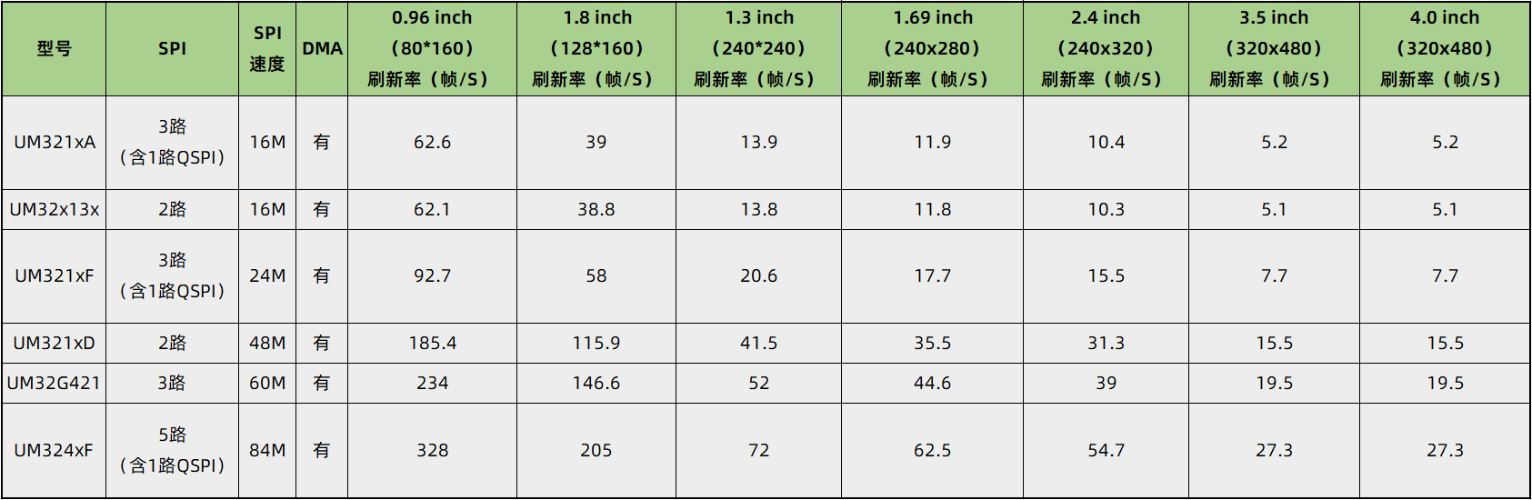 廣芯微推出一系列MCU 彩屏解決方案,接口資源和彩屏刷新率性能如下表所示(圖片、動(dòng)畫數(shù)據(jù)存儲(chǔ)在外部FLASH):