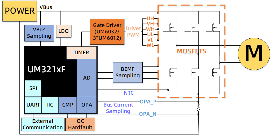 支持單/雙電阻無/有感FOC控制方案 輸入電壓:DC 12-48V 額定功率:<500W 防電源反接電路設(shè)計(jì) 支持PWM調(diào)速及FG信號(hào)反饋 順逆風(fēng)啟停 硬件過流,欠過壓,欠過溫,限/過流,堵轉(zhuǎn)等全功能保護(hù)