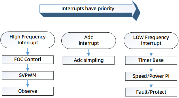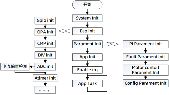 控制器上電后進(jìn)入系統(tǒng)配置,依次進(jìn)行IO端口配置,AD轉(zhuǎn)換模塊配置,定時器的配置,中斷初始化,定時器初始化,保護(hù)參數(shù)初始化,交互參數(shù)初始化,初始化狀態(tài)檢測,使能中斷,最后進(jìn)入主循環(huán)(App-Task)執(zhí)行相應(yīng)app層事件。電機(jī)控制部分主要在高頻中斷中執(zhí)行運(yùn)算,主要處理FOC運(yùn)算部分,及位置速度觀測器。ADC中斷主要處理采樣數(shù)據(jù),低頻中斷主要處理速度/功率外環(huán)控制部分及故障檢測部分。