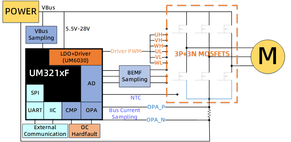 1.內(nèi)置5V LDO Power電源直接輸出至MCU(支持5.5-24V寬電壓輸入);2.內(nèi)置1路運(yùn)放可直接進(jìn)行單電阻電流采樣重構(gòu);3.內(nèi)置3路比較器快速直接獲取反電勢信號或硬件過流保護(hù) ;4.PWM支持與比較器的聯(lián)動,異常情況緊急停機(jī)保護(hù)機(jī)制,有效防止功率元器件損壞;5.內(nèi)置3P+3N預(yù)驅(qū),減少外圍電路及布板空間;6.豐富的外設(shè)接口(SPI/UART/IIC/CAN),支持多傳感器擴(kuò)展功能;7.板極ESD設(shè)計可靠度可達(dá)8KV以上,得益于廣芯微UM321xF芯片優(yōu)異的ESD性能;8.高集成度、高可靠性、低功耗MCU,電機(jī)控制相關(guān)外圍器件只有40個左右,大大降低設(shè)計及生產(chǎn)成本,降低器件失效不良率。