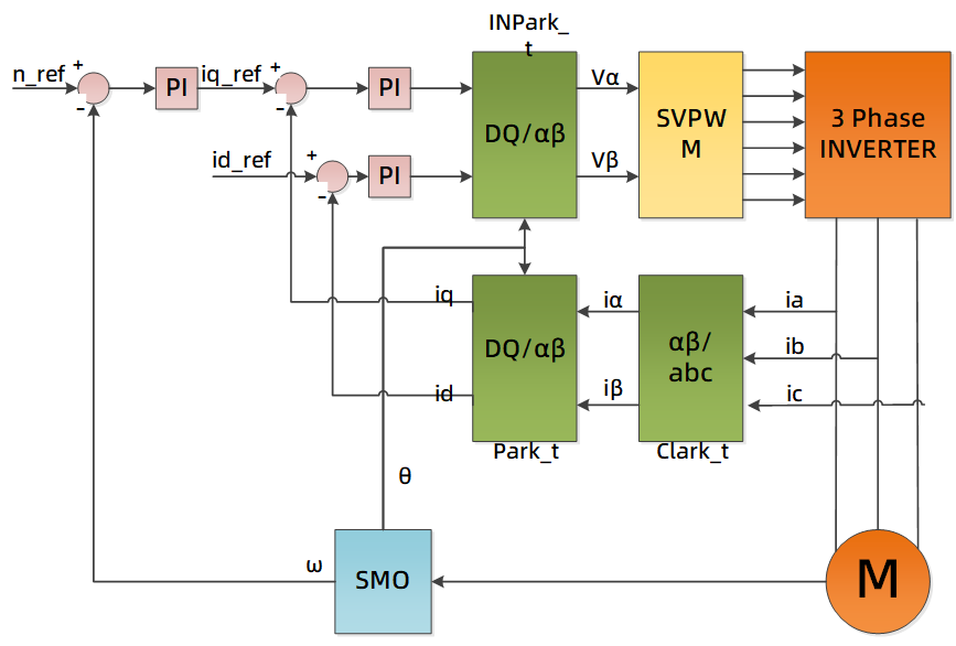 電機(jī)控制算法采用單電阻無感FOC的電流轉(zhuǎn)速雙閉環(huán)控制系統(tǒng):