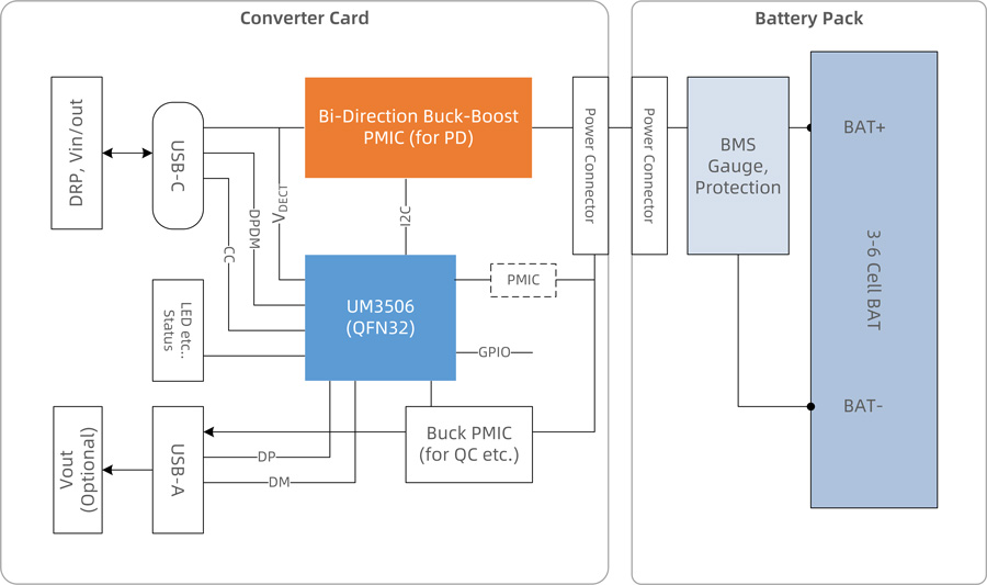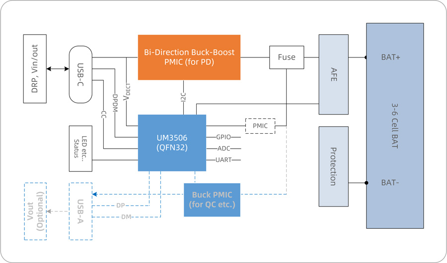 · UM3506實(shí)現(xiàn)PD DRP協(xié)議,電源管理,并可與外置的電池包上的BMS進(jìn)行通信,支持私有協(xié)議監(jiān)控電芯狀態(tài),確保充放安全。