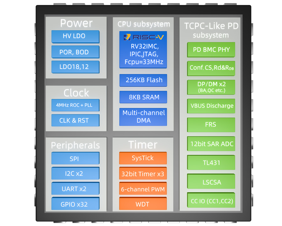 UM3506芯片集成了USB PD 3.0, PD3.1控制器和一個(gè)更加具有開放性,靈活性的RISC-V 內(nèi)核處理器。該系列產(chǎn)品可以用來支持增強(qiáng)型PD應(yīng)用。該款芯片全面滿足USB開發(fā)者論壇組織定義的USB 3.1標(biāo)準(zhǔn)集里面的相關(guān)規(guī)范。