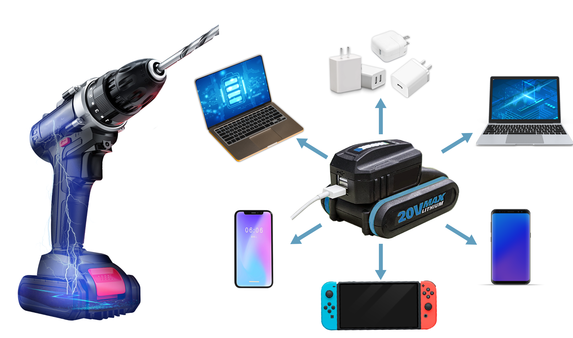 · 擴(kuò)展了電池包的應(yīng)用范圍,在無線電動(dòng)工具空閑時(shí),電池包可以隨著作為移動(dòng)電源給用戶的數(shù)碼產(chǎn)品充電。