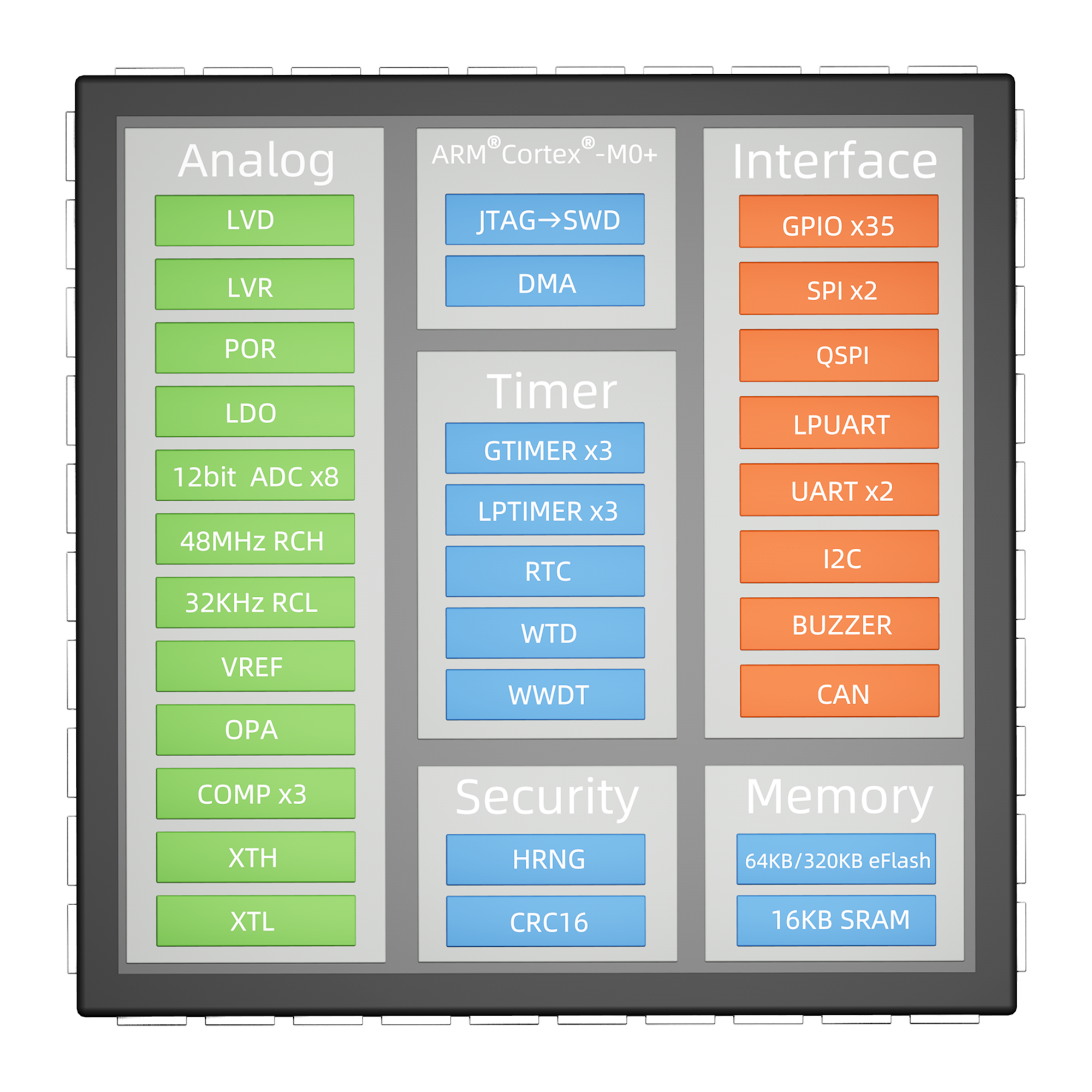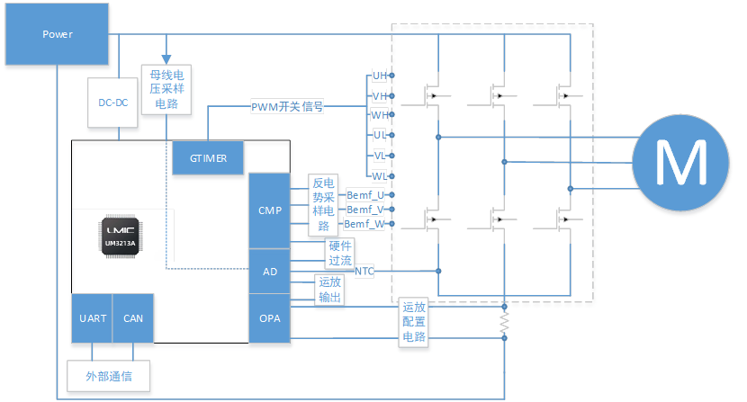 本次發(fā)布的方案是基于廣芯微低功耗32位MCU芯片UM3213A開發(fā)的設(shè)計(jì),UM3213A采用ARM Cortex-M0+內(nèi)核,主頻32MHz,內(nèi)置64KB閃存,支持1.8~5.5V寬電壓工作范圍,支持3路互補(bǔ)PWM輸出,內(nèi)置1路運(yùn)放和3路比較器,支持8通道12位1MspsADC轉(zhuǎn)換器、多路UART、SPI,I2C等豐富外設(shè)接口,具有高整合度、高抗干擾、高可靠性的特點(diǎn)。芯片支持9路PWM和1路CAN總線,提供35個(gè)GPIO。