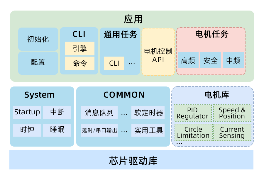 此方案整個(gè)軟件工程分為應(yīng)用層、System、Common及電機(jī)庫。應(yīng)用層包含系統(tǒng)初始、系統(tǒng)配置、CLI引擎、通用任務(wù)、電機(jī)控制API、電機(jī)任務(wù)等。System層包含Startup啟動(dòng)、中斷服務(wù)、時(shí)鐘、睡眠與低功耗等。Common層包含消息隊(duì)列、軟定時(shí)器、延時(shí)/串口輸出、實(shí)用工具等。電機(jī)庫包含PID 環(huán)路、換相函數(shù)處理、芯片驅(qū)動(dòng)庫等。
