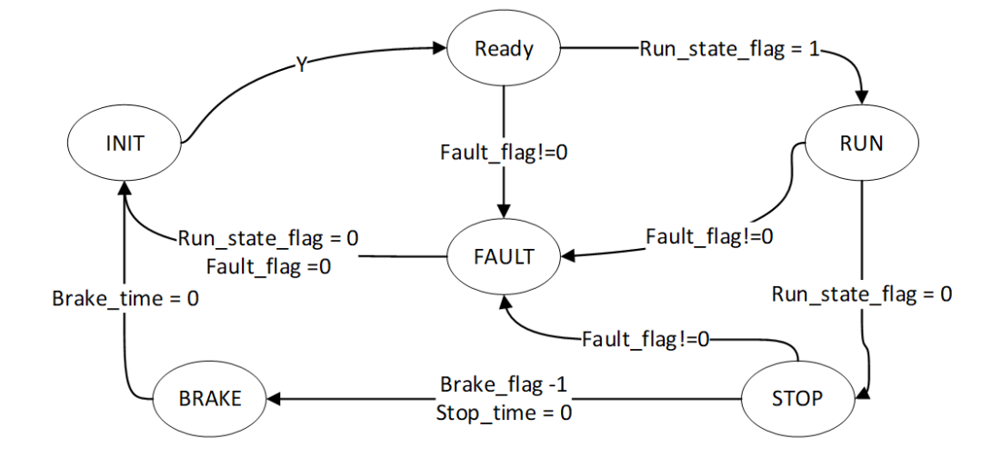 電機(jī)運(yùn)行狀態(tài)分為 INIT、 READY、 RUN 、STOP、 BRAKE、 FAULT 6個(gè)狀態(tài):