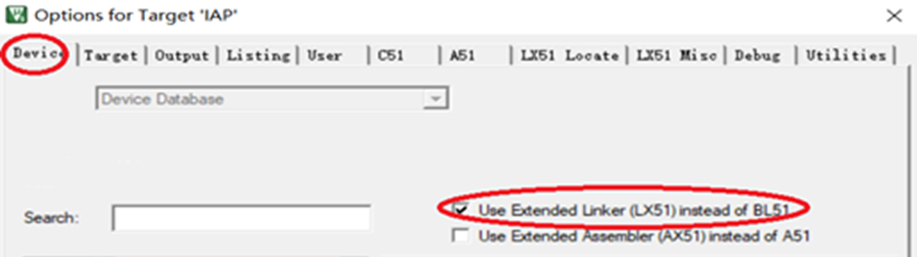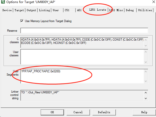 (2)設(shè)置IAP_Proc函數(shù)(IAP更新處理程序)的入口地址,用絕對(duì)地址定位的方法設(shè)置在某個(gè)固定的地址,下面以設(shè)置地址為0x0200為例。點(diǎn)開(kāi)keil C51中的Options for Target,勾選下圖所示的地方。