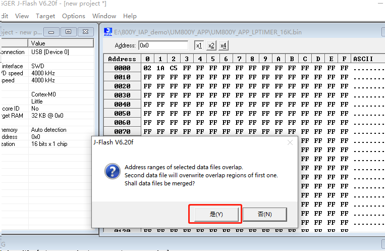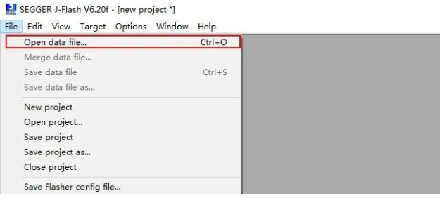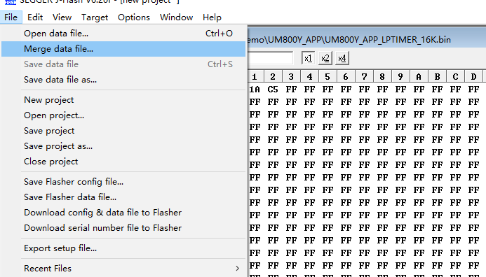 首先打開(kāi)J-Flash工具。點(diǎn)擊open data file,打開(kāi)用戶app程序的bin或者h(yuǎn)ex文件。這里選擇軟件開(kāi)發(fā)包里UM800Y_APP文件夾中的Lptimer工程中的bin文件。(可通過(guò)hex2bin工具將hex轉(zhuǎn)換成bin文件)