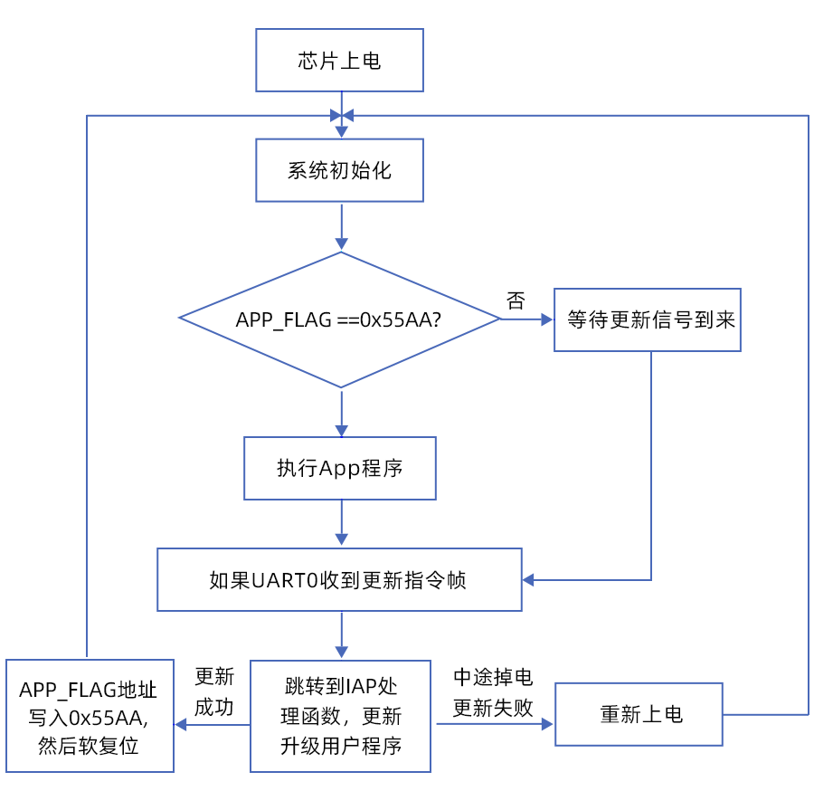 使用IAP的上位機(jī),通過(guò)IAP程序的處理函數(shù),即可實(shí)現(xiàn)應(yīng)用程序的更新升級(jí)。整個(gè)IAP的實(shí)現(xiàn)流程如下圖所示: