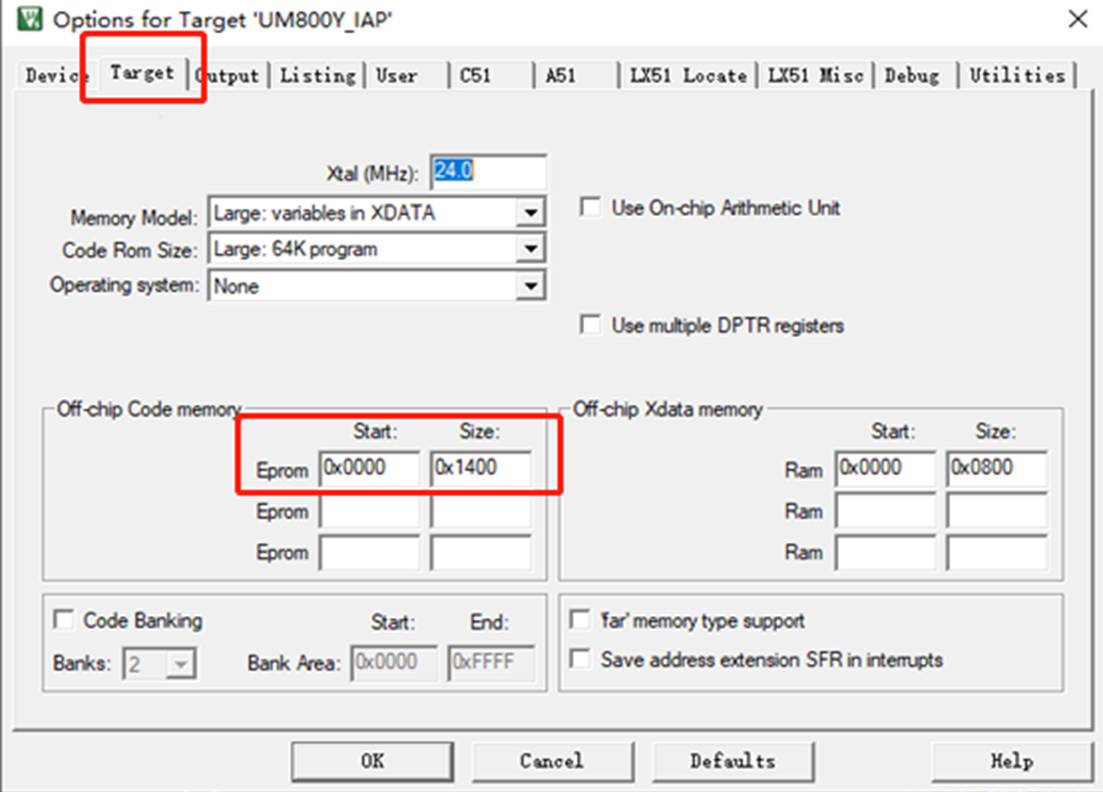 (1)需要在Target選項(xiàng)卡里設(shè)置我們IAP程序的起始地址與大小,如: