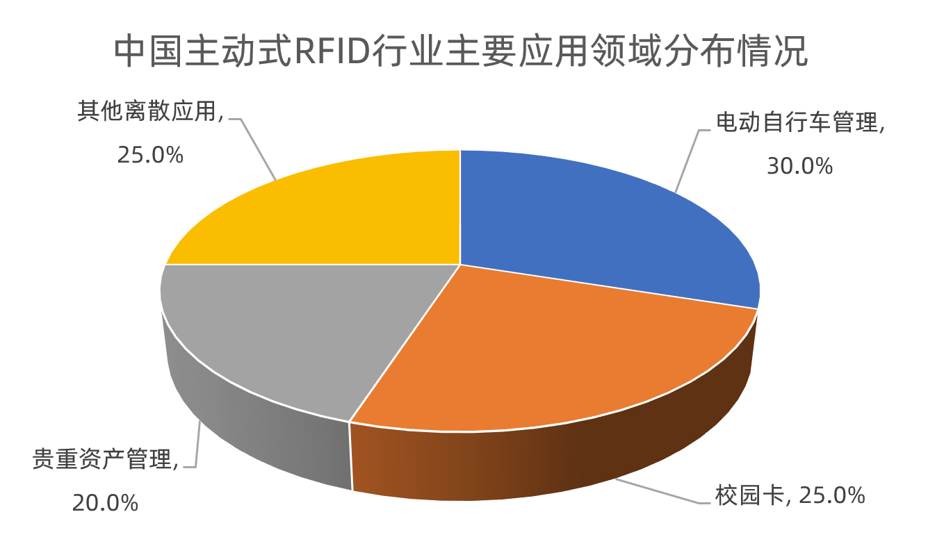 根據(jù)物聯(lián)傳媒公布的數(shù)據(jù)顯示,近幾年我國(guó)主動(dòng)式RFID整體出貨量每年大約3000萬(wàn),市場(chǎng)產(chǎn)值為數(shù)十億元,其最主要的應(yīng)用有校園卡、電動(dòng)自行車管理、貴重資產(chǎn)管理以及其他的零散應(yīng)用,尤其校園卡應(yīng)用與電動(dòng)自行車管理是有源RFID最為集中的應(yīng)用場(chǎng)景。根據(jù)物聯(lián)傳媒發(fā)布的數(shù)據(jù)顯示,在主動(dòng)式RFID主要應(yīng)用領(lǐng)域中,電動(dòng)自行車管理領(lǐng)域應(yīng)用占比達(dá)30%,校園卡應(yīng)用占比為25%,貴重資產(chǎn)管理領(lǐng)域應(yīng)用占比為20%。