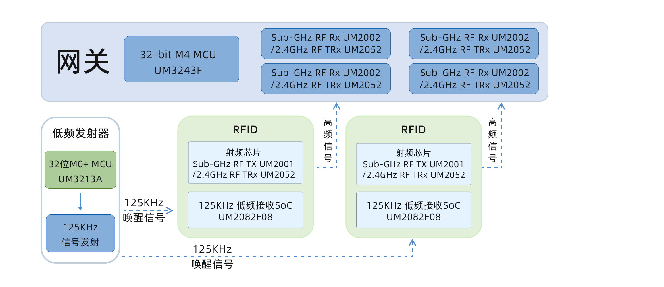 · UM2082F08:低功耗低頻喚醒SoC,內(nèi)部集成125KHz低頻ASK接收器器和低功耗8位處理器,支持三個(gè)獨(dú)立通道的信號(hào)接收及處理